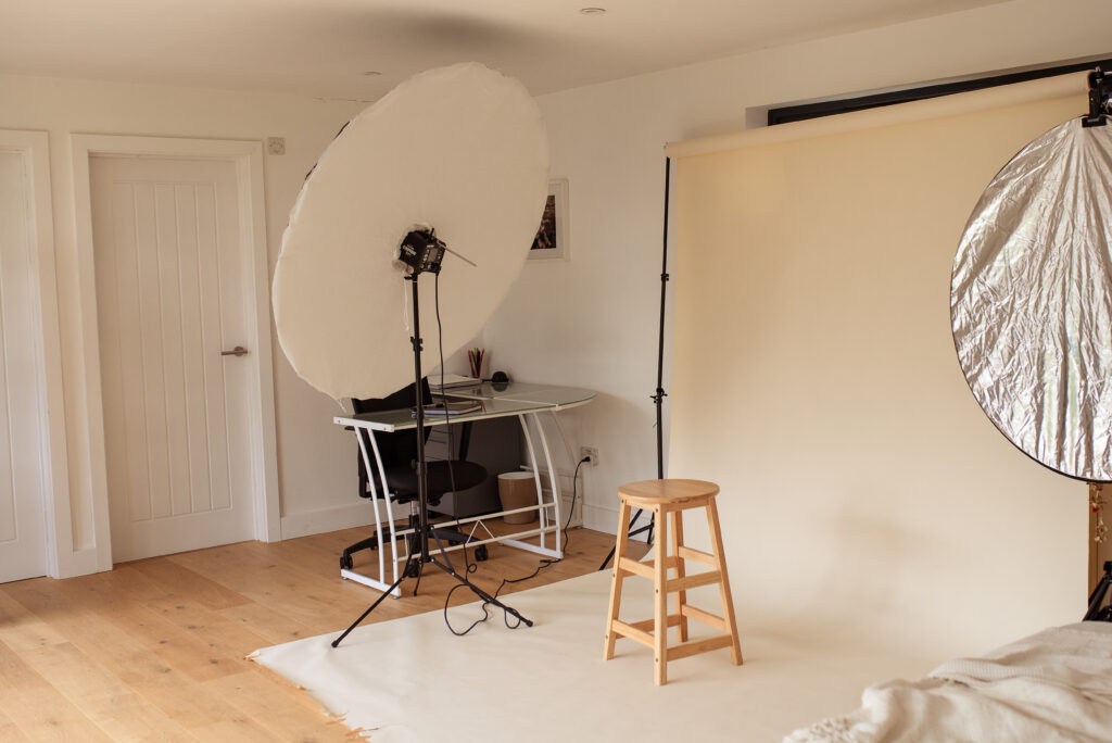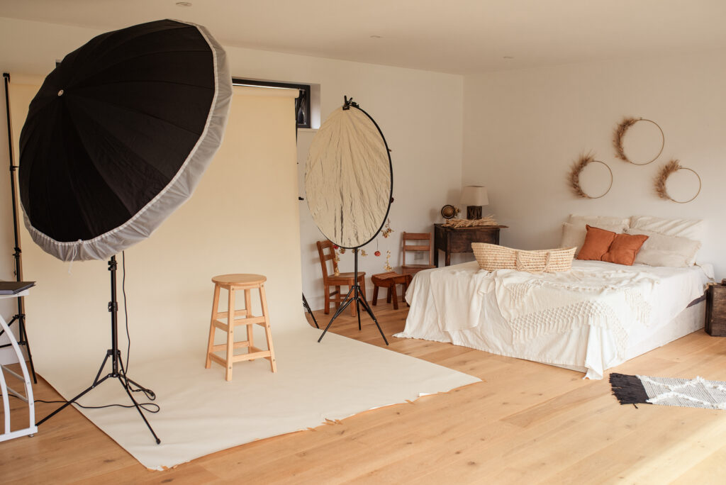 One of the highlights of my studio is the lifestyle area, bathed in natural light streaming through big windows, complete with a cozy bed for capturing stunning natural light images. Decorated with beautiful dried flowers from The Flower Project, a local eco-friendly flower shop in Cambridge, the space exudes a sense of tranquility and elegance.